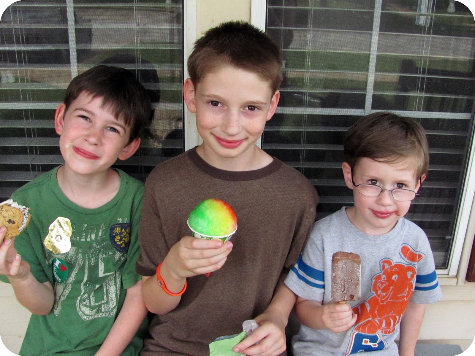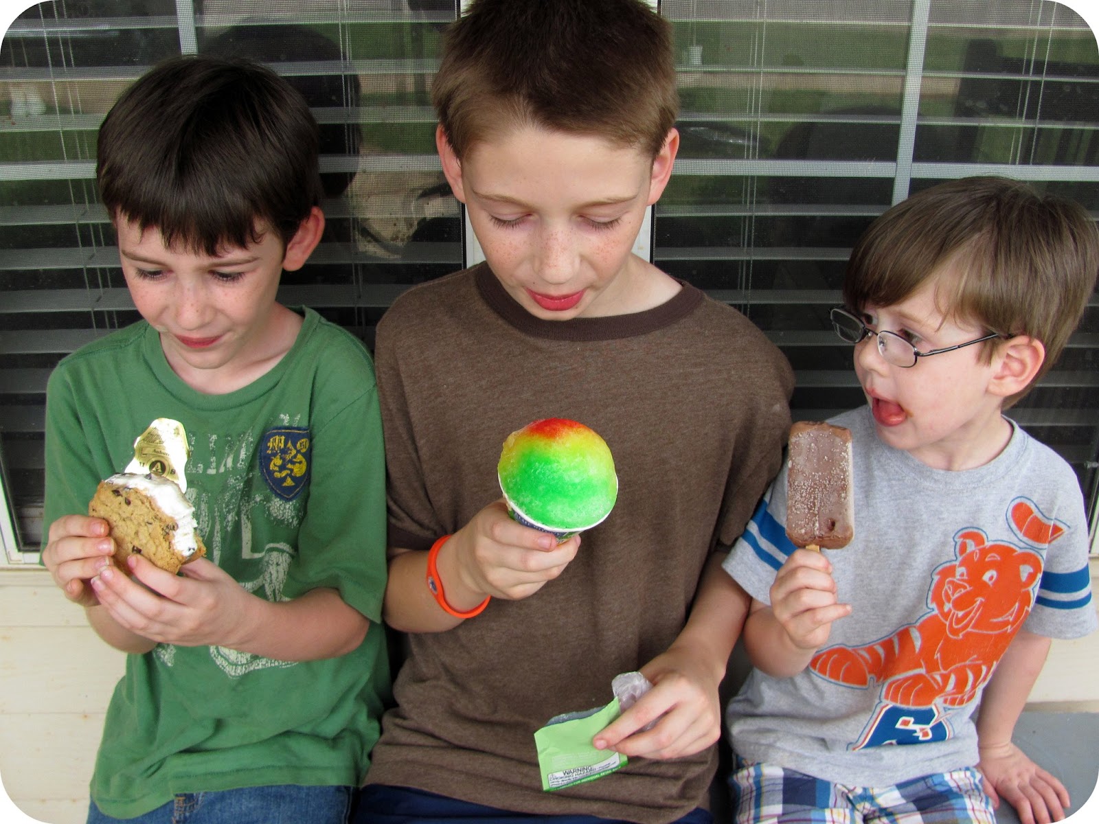 Tank chose an ice cream sandwich, Monkey had a snow cone and Specs was happy with a plain old fudgesicle. Makeema, the maintenance man is apparently a regular of the ice cream truck and has a fondness for ice cream sandwiches too. He is this giant of a man and such a cool guy. It cracked me up when he told me he was there to "embrace his inner child".