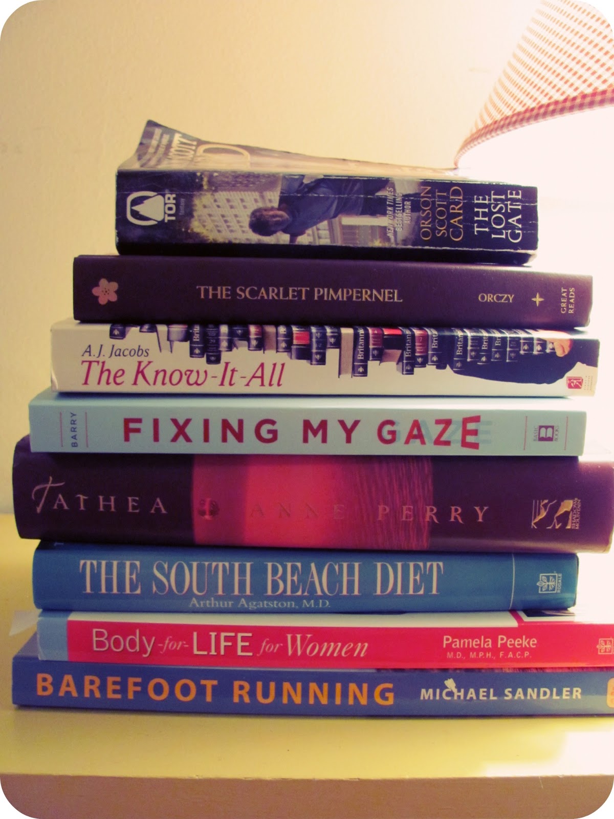 I have a small book case beside my bed. These are just the books stacked on top that are in my read-in-the-near-future pile.