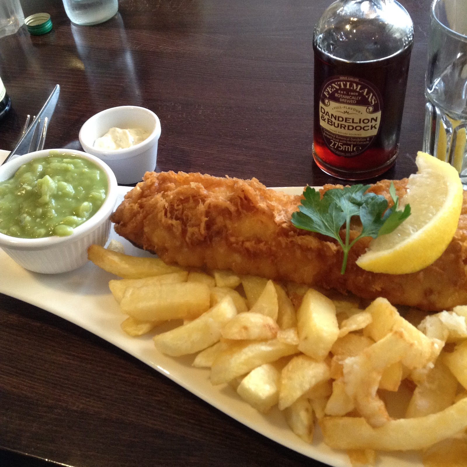 Bell's was an excellent choice. I have never had such delectable fried fish in all my life. We tried the mushy peas--fabulous! The chips were delicious too. I had Dandelion and Burdock soda because when would I have another chance to try that? It sounds weird but it was very tasty.
