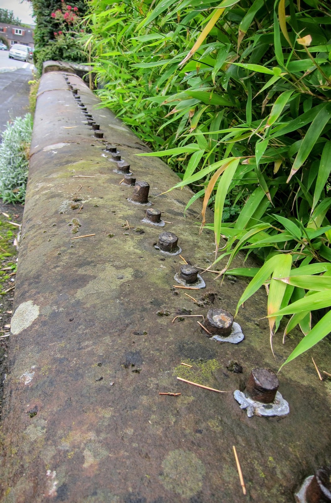 | During WWII people cut down their iron fences to donate the scrap metal to the allied cause. You can see these nubs of fence posts throughout England and Scotland. |