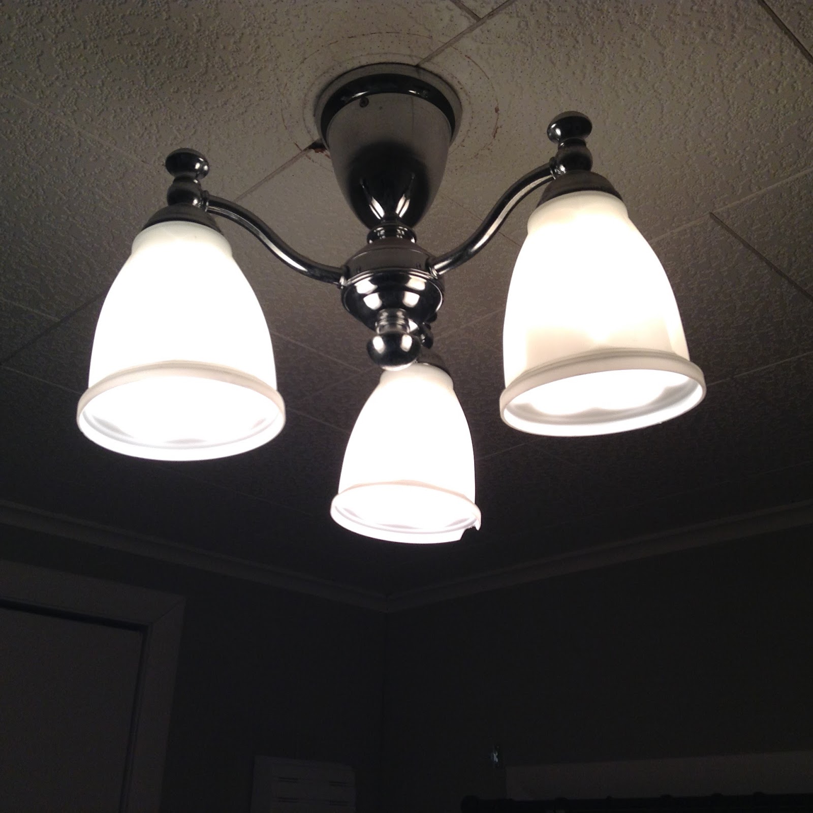 This is the light fixture. It is a little too low for our tall family (two members of the family are over 6'2" and three members still growing). We'd like to replace it with something flush mounted if we can find something we like so that people don't feel the need to always be ducking their heads when they come in through the front door. Also, as you can see the one shade is chipped so that needs attention.