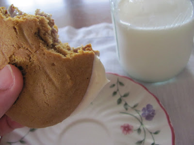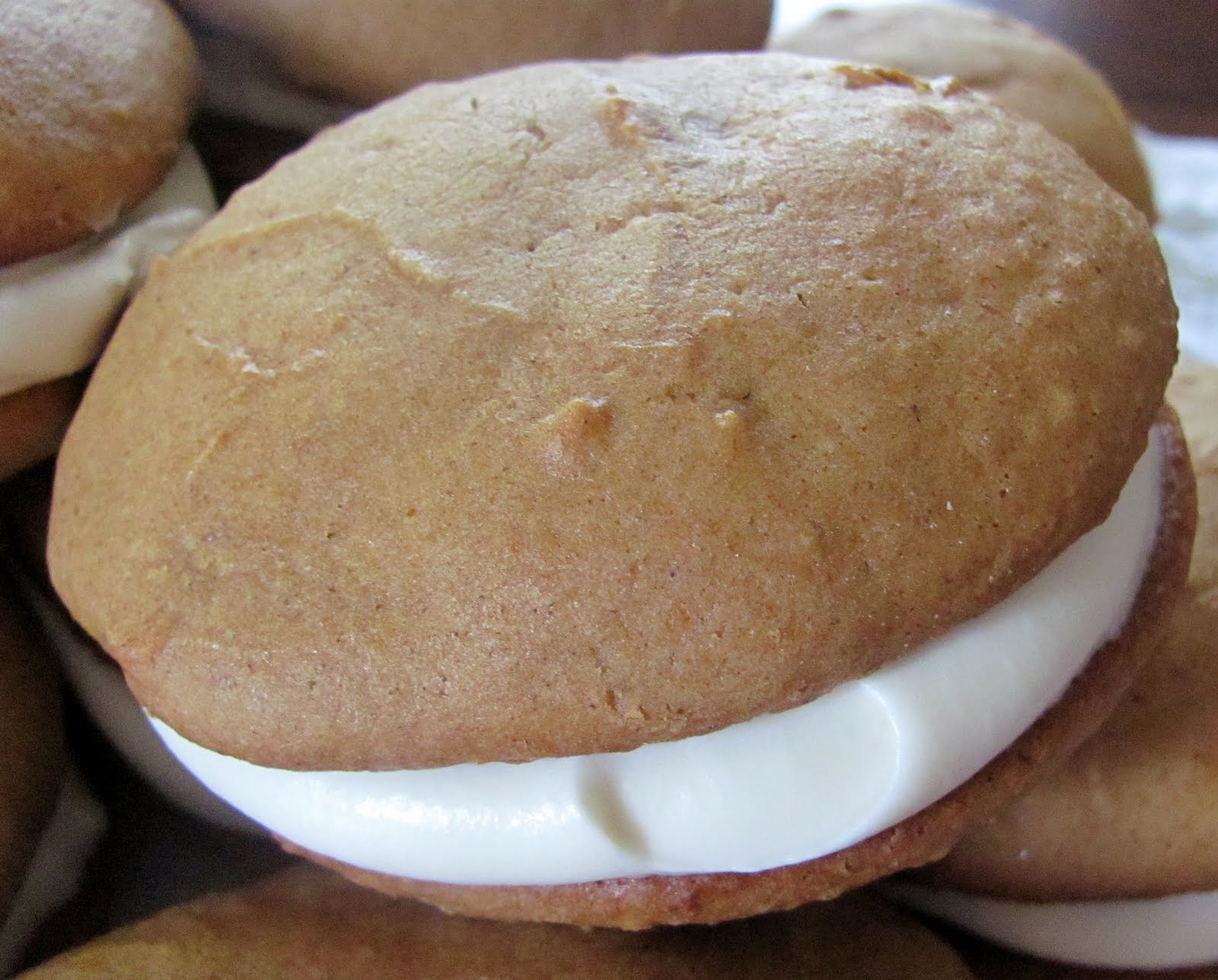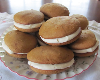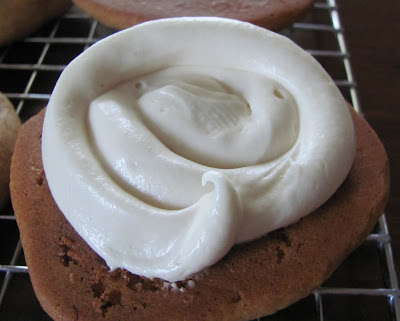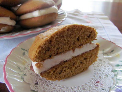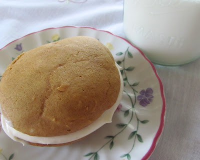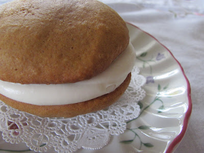 For those of you who don't know, whoopie pies are kind of the humble, more homey cousins of cupcakes--delicious creamy frosting/filling sandwiched by two, big, soft, cake-like cookies. According to Wikipedia: