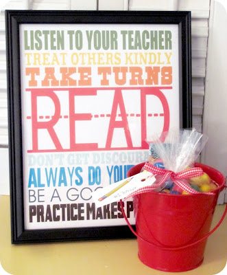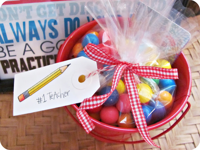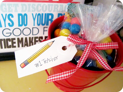 Yesterday I threw together some last minute teacher gifts for the younger boys' teachers. I love bright, colorful things for elementary school teachers. I used cheap Target frames for THIS printable subway art from the girls at Eighteen25 and stuck a book store gift card into the pail of gum balls. I added a quickly stamped tag and that was it. It really only took be about 5 minutes to put it together.