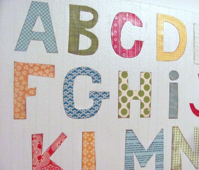 I put my letters where I wanted them and tacked them down lightly with a little bit of glue stick. When I finally found my Mod Podge (which took me forever to find because my organizational skills stink right now) I Mod-Podged over the whole thing with a sponge brush to seal it.