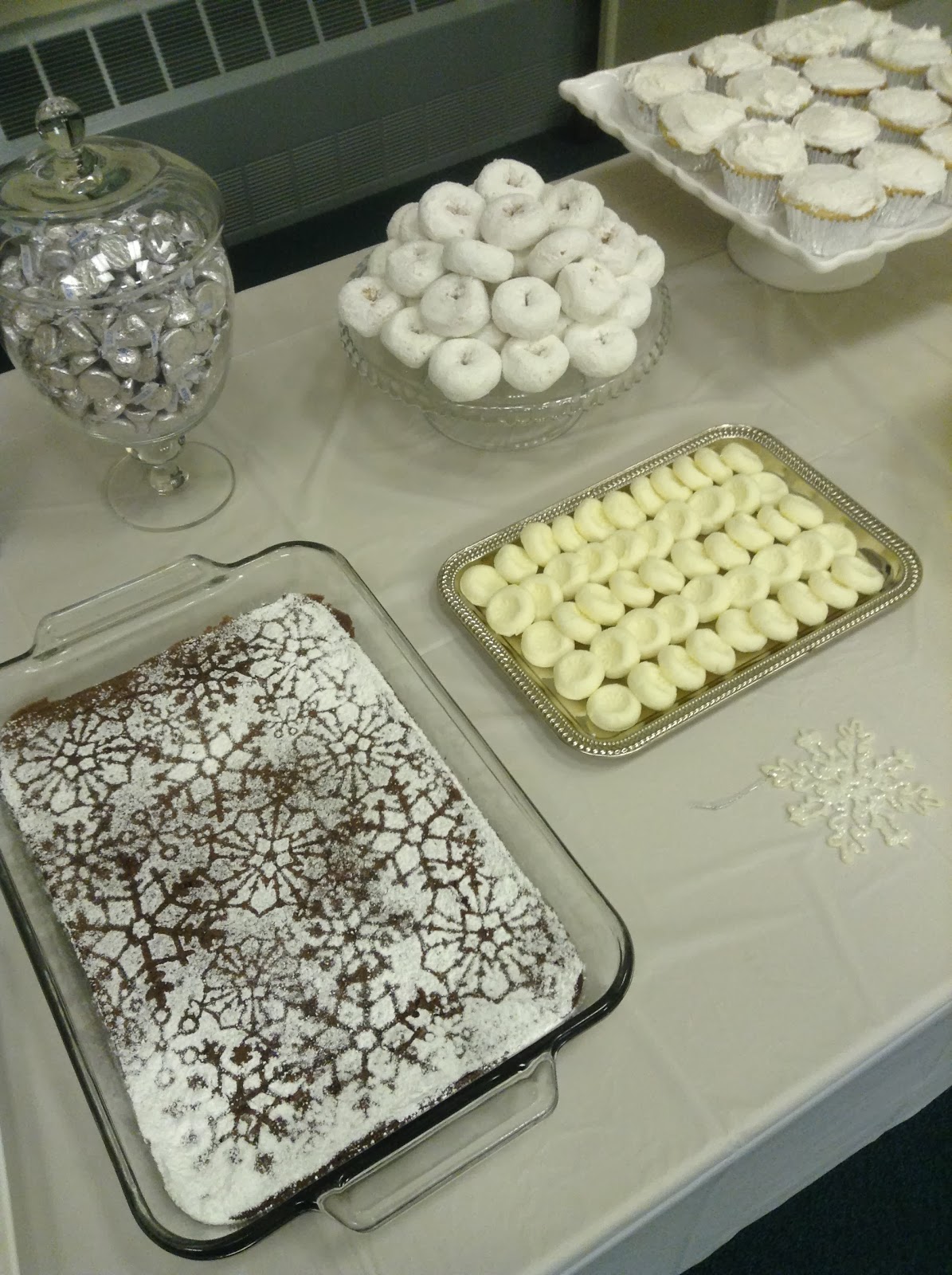 --A selection of desserts including: brownies, powdered sugar doughnuts, white cupcakes with white frosting, Hershey's kisses, snowballs (that I forgot to put out) and homemade butter mints