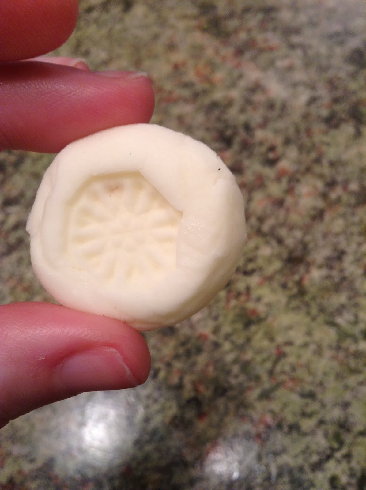 You can use a fork to flatten the mints, but I used a clean rubber snowflake stamp to go with our "Winter Wonderland" theme. |