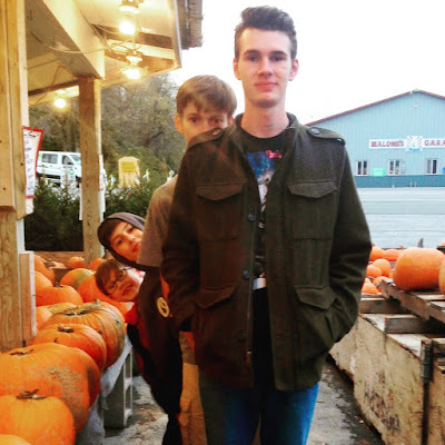 We jetted over to the high school, picked Joel up from football practice and by that time it was time to go back to the merit badge dude's house and pick Seth up. Seth had band at 6:00, so I knew we didn't have any time to go home first--we turned the car around again and drove straight out to Ontario Orchards (our favorite local farm stand) where I had heard that there was a pumpkin patch. When I asked where the patch was once we got there, they told us that all the pumpkins had been picked, so we just ended up choosing one from the already harvested lot.