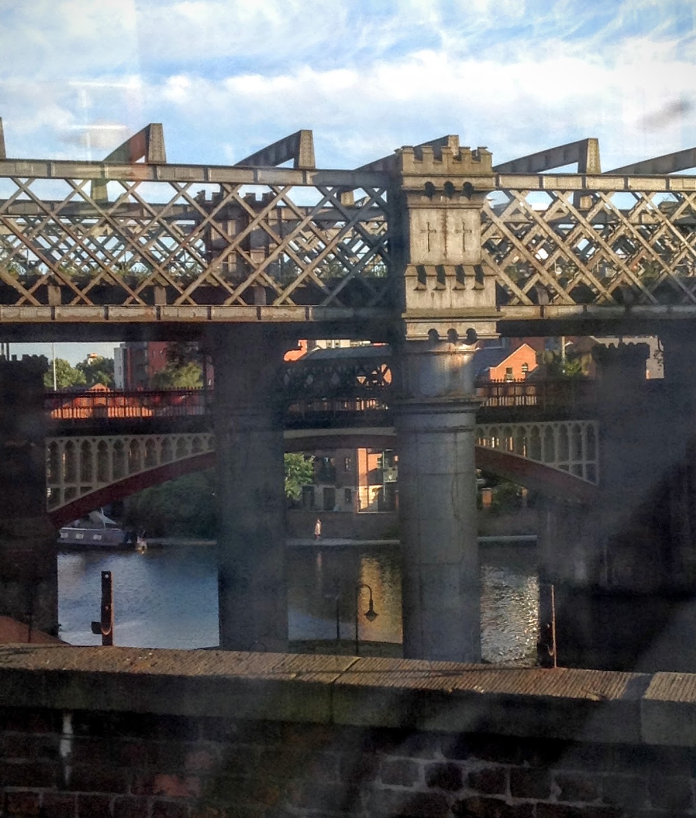 The TransPennine Express train to Manchester was quite crowded at first. A woman from Bahrain sat at our table with us. She didn't speak much English but we managed to learn that she was traveling with her large family, her husband, three children and several other people--mostly women. Not sisters. Not nieces. We're pretty sure that it was a polygamist family. She was nice and we shared pictures of our families and talked a little until her family got off the train a few stops before Manchester.