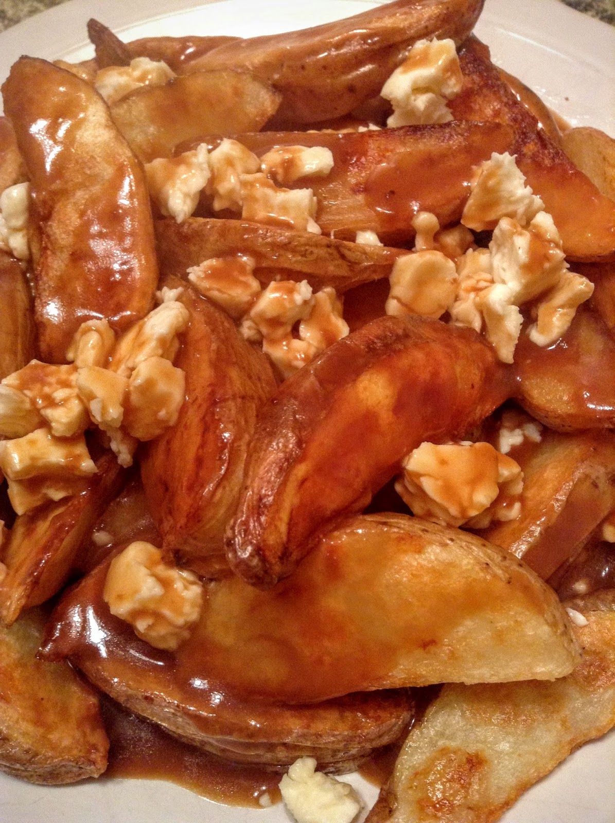 Since we are close enough to Canada here in central NY to see border patrol vehicles routinely, it shouldn't surprise you that we are lucky enough to be able to get this delicacy at the concessions at the college hockey games. However, since most of you aren't so lucky, I decided to share our homemade version: crispy-fluffy homemade fries, lick-the-plate-good gravy and local fresh cheese curds.