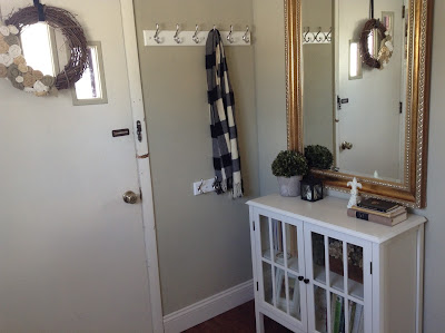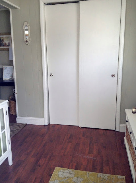 Below is the view from the threshold of the front door looking into the entry area. This is what anyone who comes to our door sees. Not super impressive. That closet straight ahead is unattractive but necessary. It holds all our winter gear, hats, purses, jackets, spare computer cords and cables, our ice cream maker, and vacuum, among other things. Converting it to something cute like this isn't really practical but I do love the idea of replacing the decrepit doors that are always coming off the track with something like this (I really love the idea of sliding barn doors too, but I'm not sure the space would accommodate them).