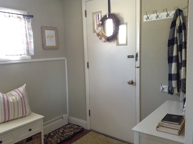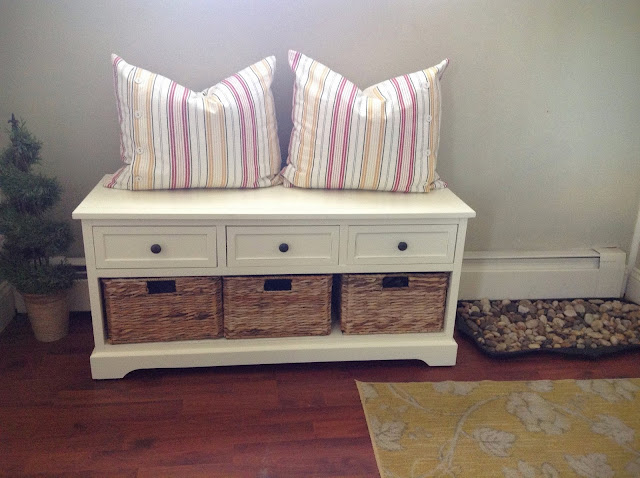 This bench was a gift from the in-laws for Christmas. It also makes me happy (have I mentioned how great my in-laws are?). I put a couple of pillows on it to prevent it from getting scratched up. Eventually it would be nice to have a custom cushion on there. I love all the storage for our hats, gloves, scarves and such. It is very practical at this time of year for friends to come in, sit down and take off their boots and put them on the boot tray (the tray of rocks to the right). For some reason my boys' friends would rather leave their boots on the floor in a muddy puddle of melted snow and salt though. Maybe my dollar store rocks in the boot tray intimidate them? We're working on that.
