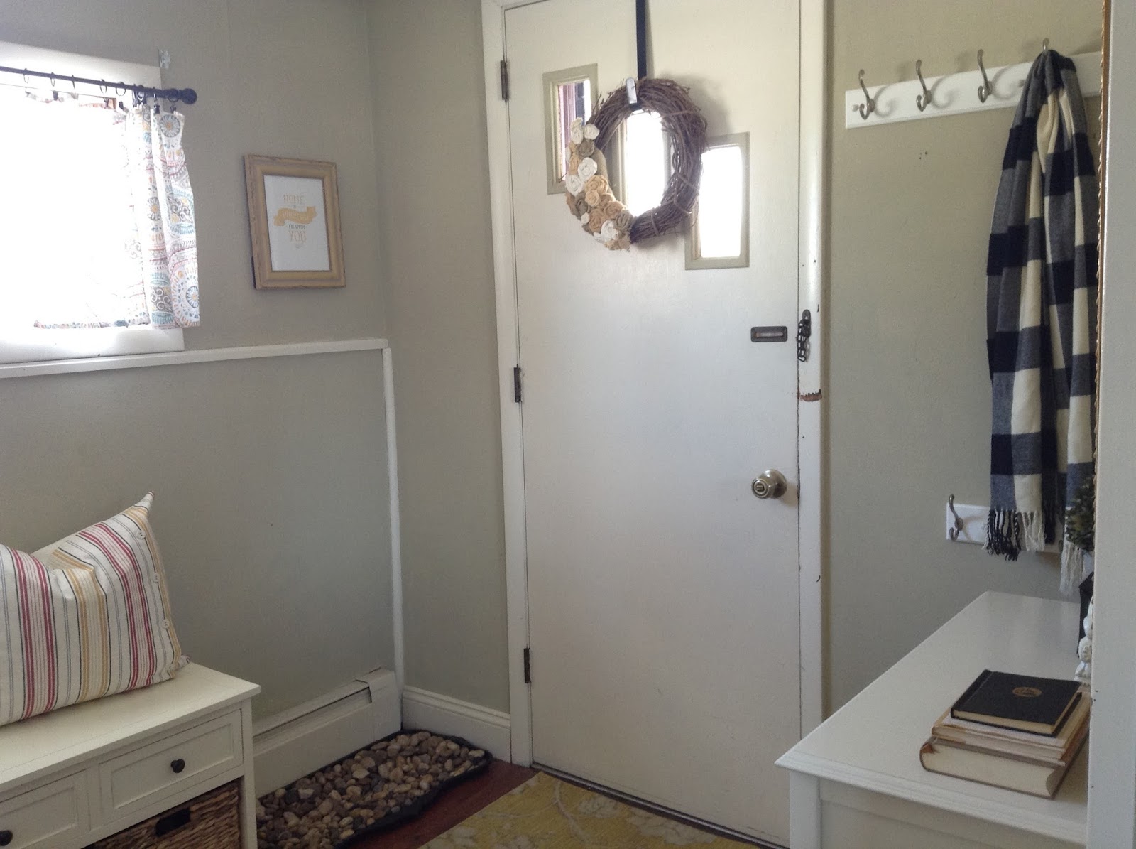 Because of the problems we've had the last couple of winters with the melted snow and salt puddling in the entryway (despite our efforts to provide a boot tray for visitors and family), I'd like to eventually replace the flooring with something more durable. I'm really in love with slate tile at the moment, but we'll see.