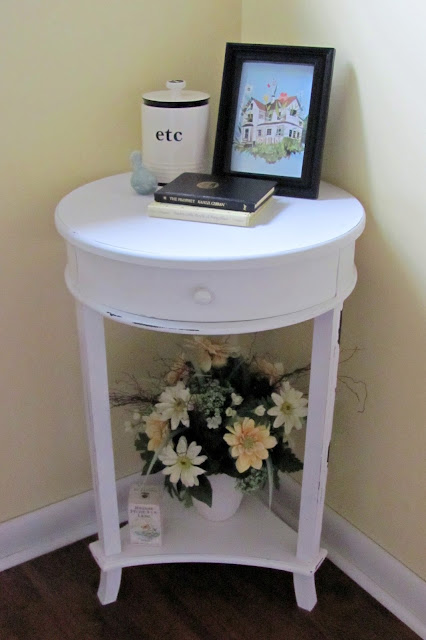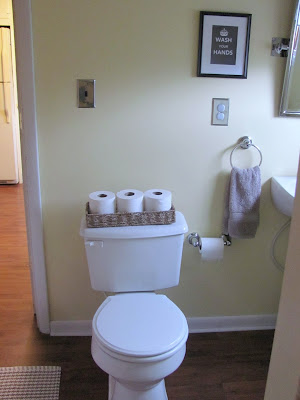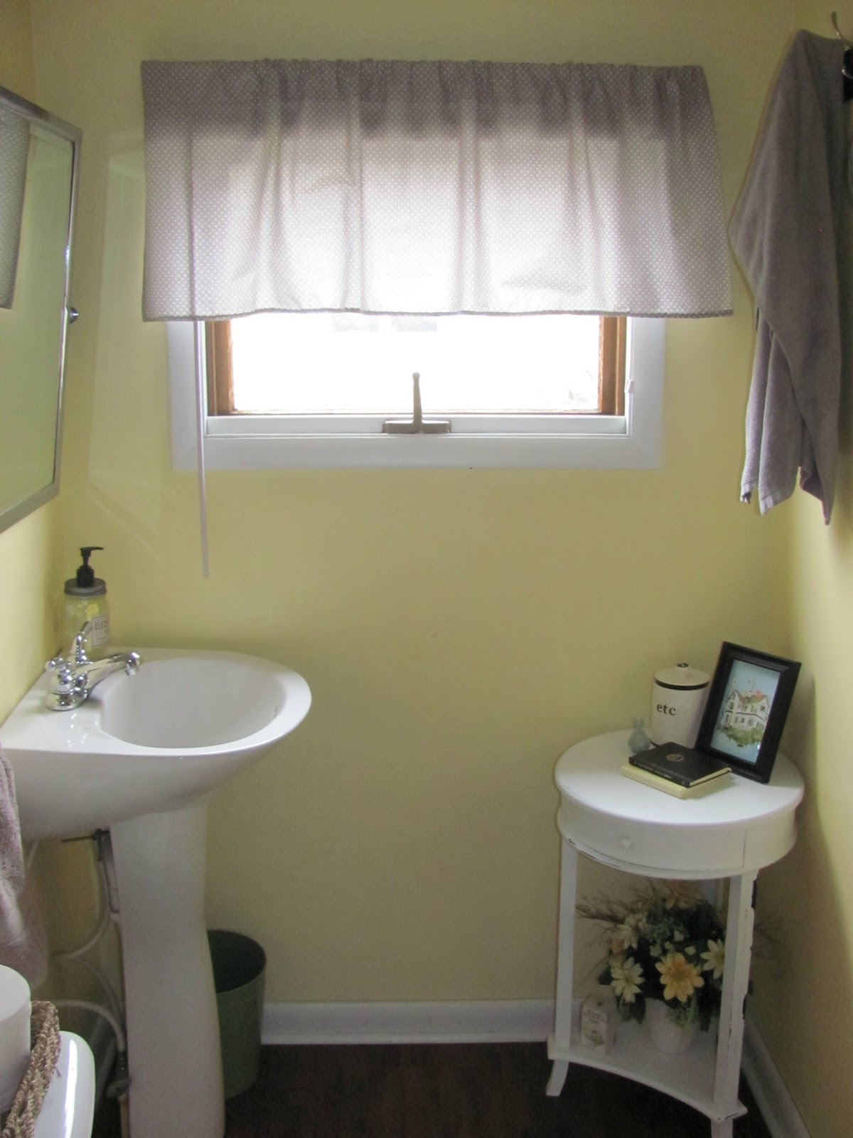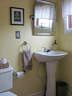 I love this little room. The main issue is that it is cold. It is part of an addition to the house and it isn't properly insulated. At the moment with things the way they are we can't shower in this bathroom in the winter because the water freezes in the p-trap. My husband is going to install a pipe warmer thingy (very technical, I know) and I'd like to get a small space heater for the room. I'd also like to replace the dome light with something cuter. I don't mind the floors, but I feel like tile would be more practical in a bathroom/laundry room so that's a possibility for the future as well.