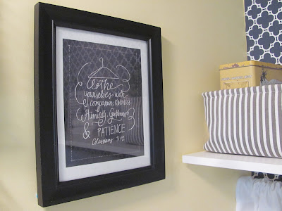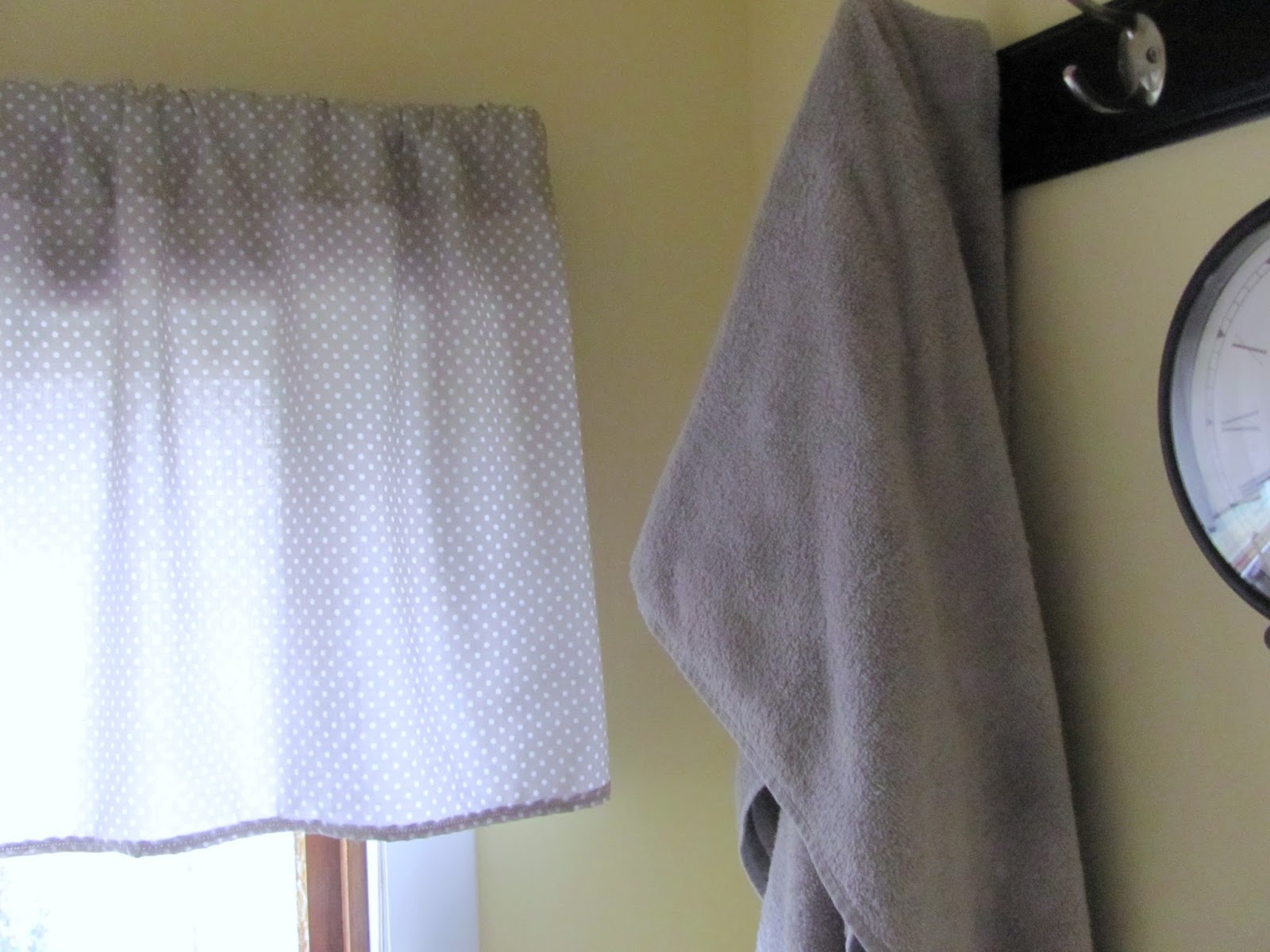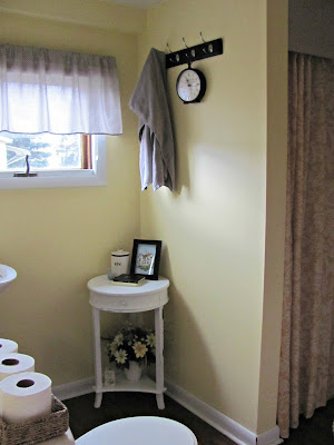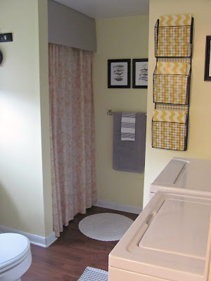 The room was painted yellow, but it was a little too bright and had too much green in it so it almost bordered on fluorescent. The wall behind the washer and dryer was just white and there was a smallish (around a foot wide), coated wire shelf screwed to the wall. There was a large hole that was cut in the drywall for the washer hose and dryer vent to go through into the basement. The wall where the hooks are now had a large industrial looking metal hook that was partially coated with orange vinyl. The shower is that goldenrod color that was popular in the 70s and there wasn't really any window treatment to speak of other than the mini blinds. The flooring is the same laminate flooring that is throughout the rest of the downstairs (except for the family room). It was all as ugly as it sounds. Maybe more so. Not anymore.
