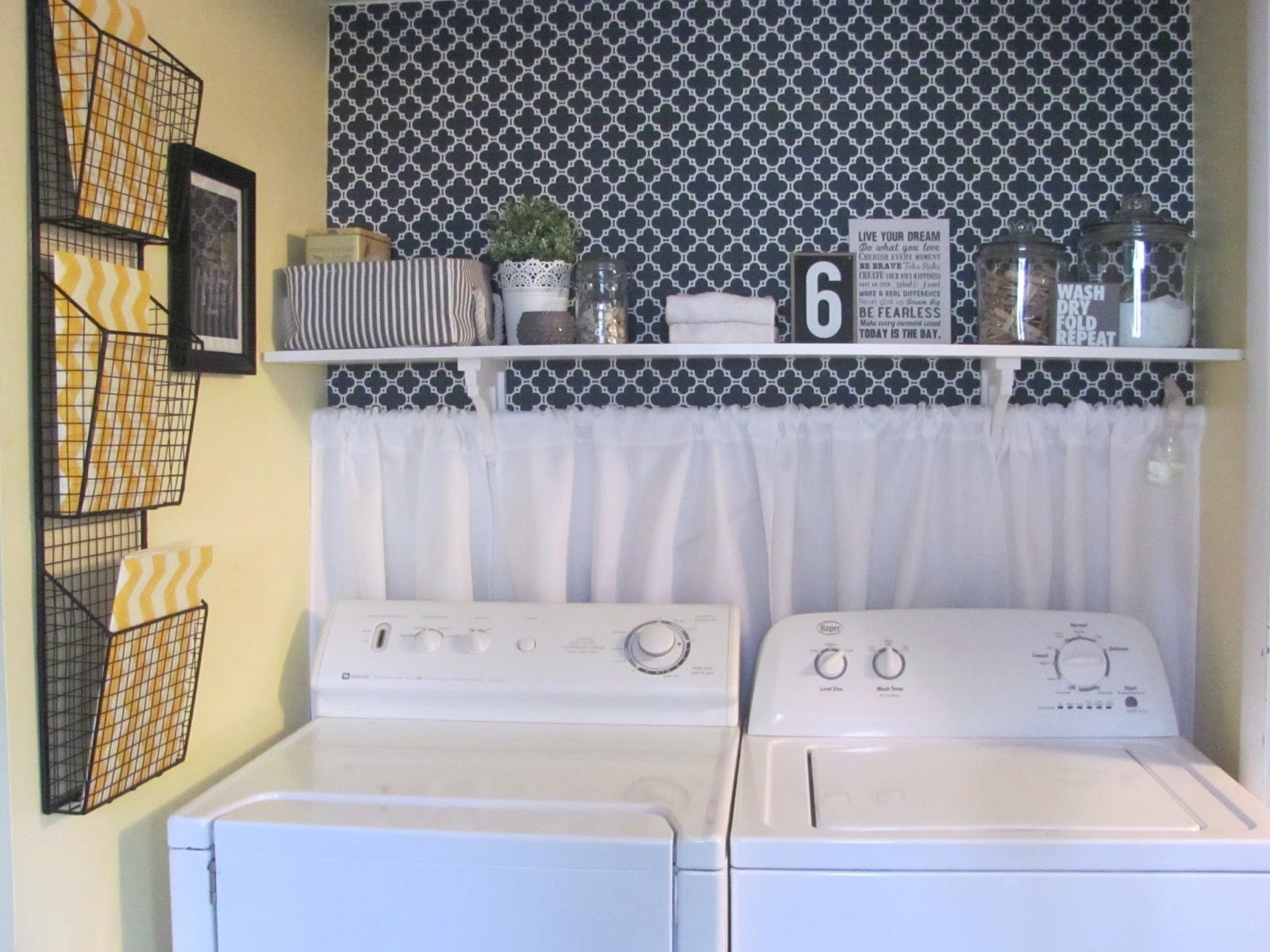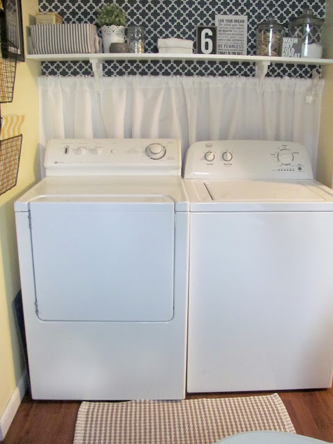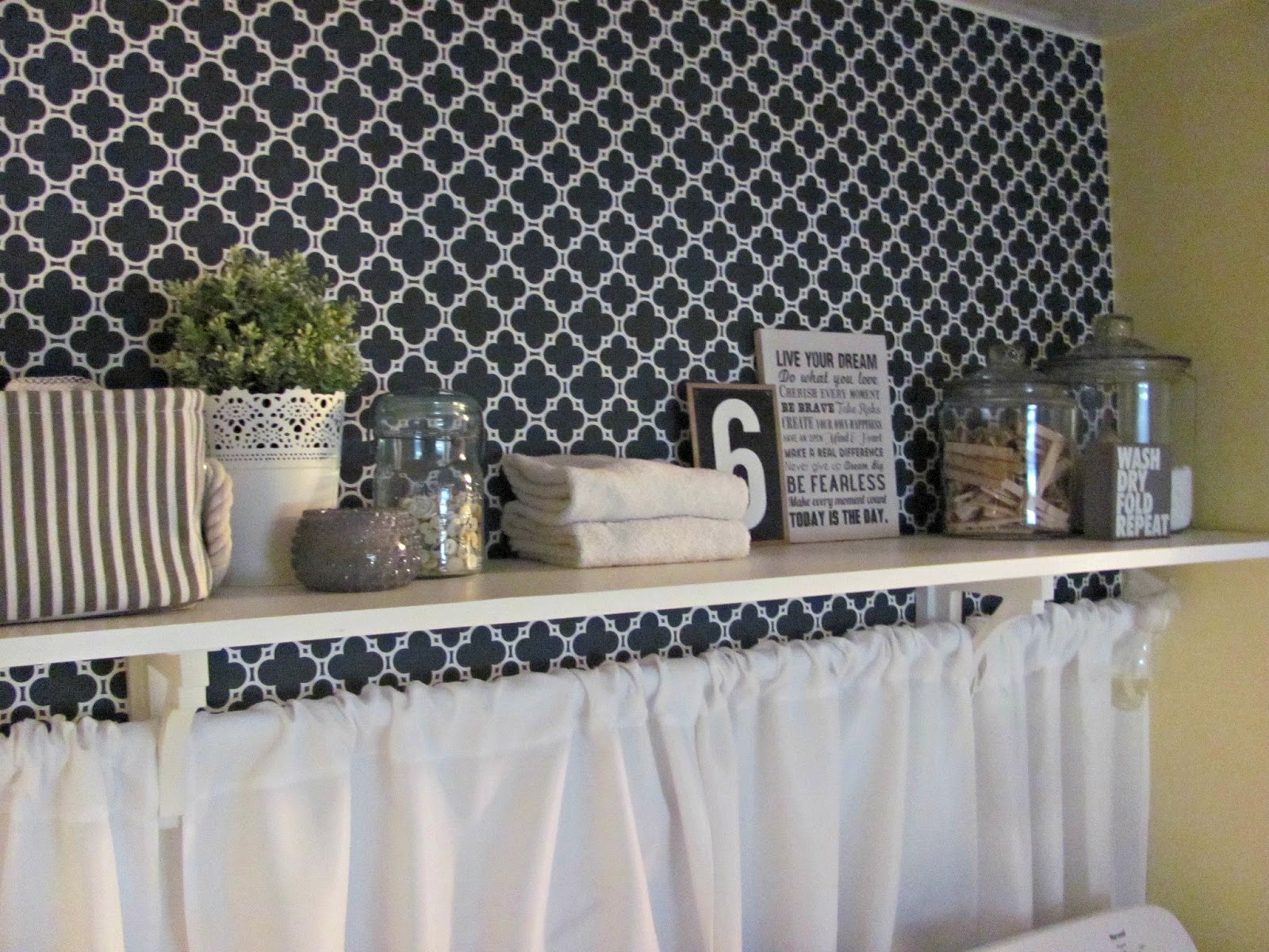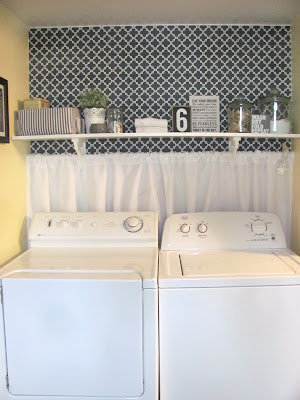 I wanted to do something interesting behind the washer and dryer. I looked at wallpaper on line, but it can be pretty pricey. I ended up wallpapering the wall with some $3.00 wrapping paper from TJ Maxx. It was a nice thick wrapping paper so I just decided I would go for it and try it out. If it didn't work I was only out $3.00 and the cost of the wallpaper paste. I purchased a bottle of roll-on wallpaper paste at the home improvement store and it worked beautifully. I only had a partial roll of paper when I got the idea to wallpaper with it, so there wasn't enough to cover the whole wall. I wanted to install a shelf anyway, so when we put up the shelf, we just put it a little above where the wallpapering ended. I used a tension rod and two really cheap curtain panels (which I cut in half and sewed into four panels to be wide enough to stretch the length of the wall) and installed them under the shelf. This covered up the ugly but necessary hole in the drywall and the hoses and electrical outlet and camouflaged the fact that I didn't have enough wrapping paper to paper the whole wall.
