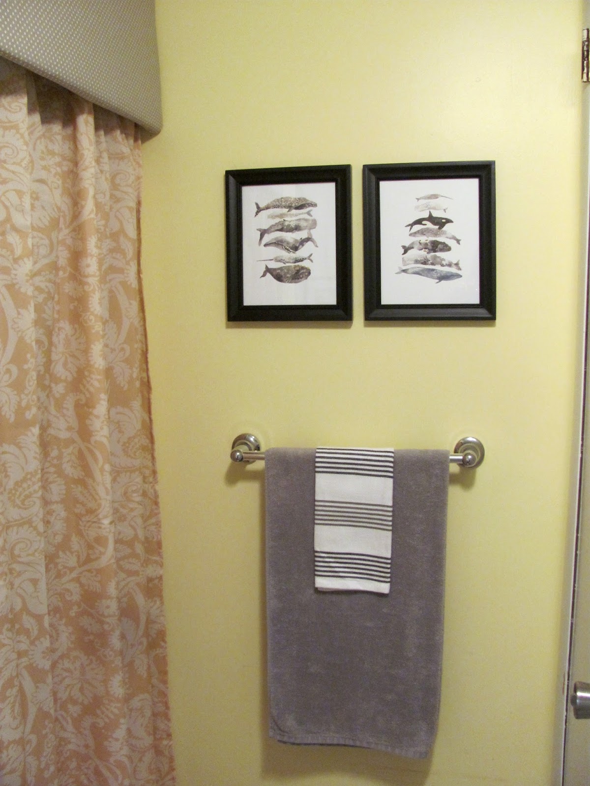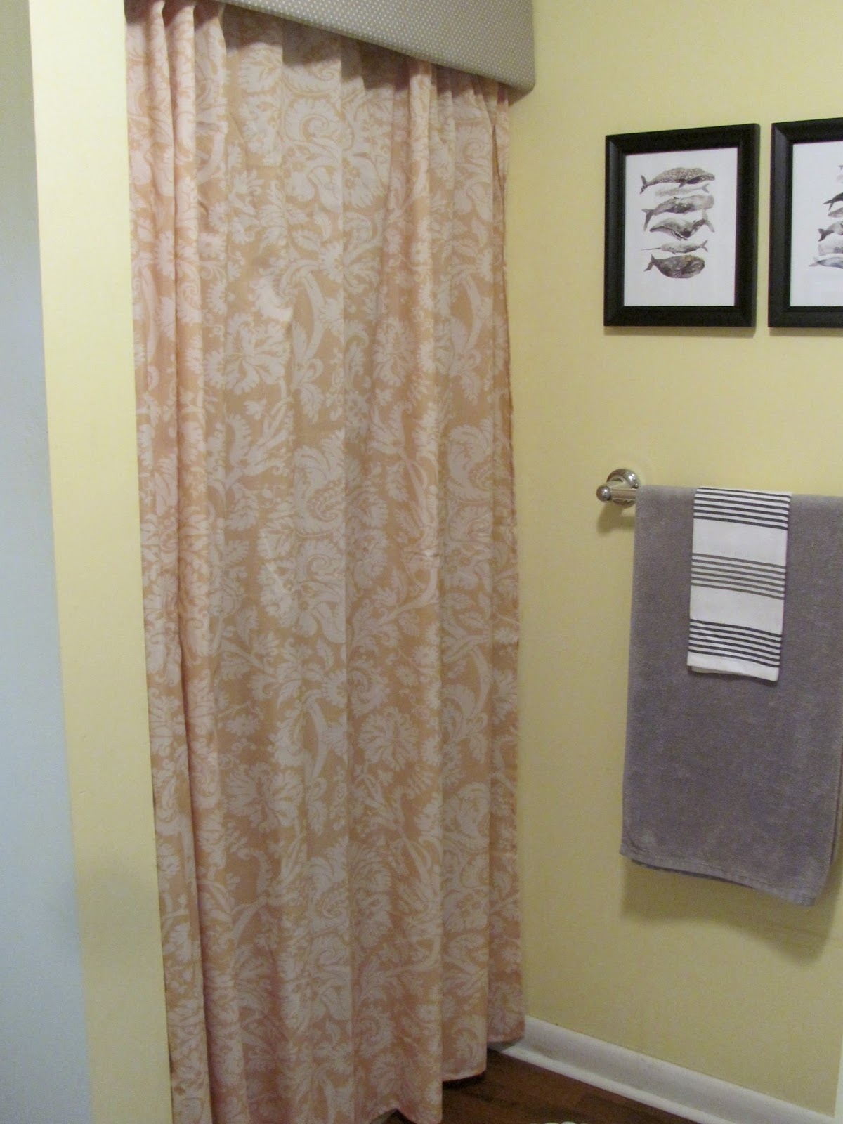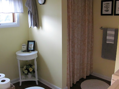 My bathroom redo started with a yellow shower curtain that I found on clearance. I think I maybe paid $7.00 for it. I knew replacing the goldenrod shower wasn't feasible so I decided to work with it instead of fighting against it.