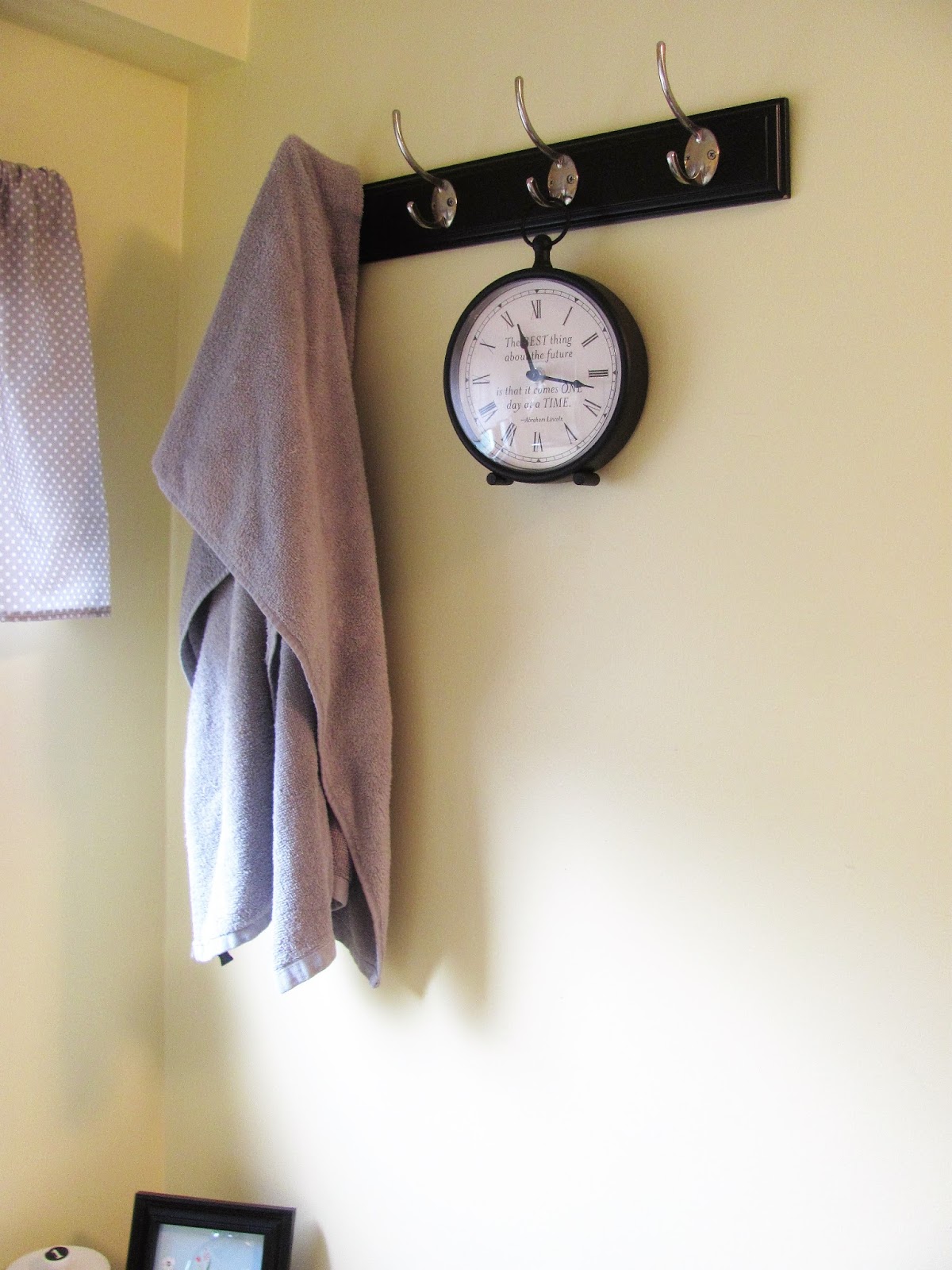 I sewed a simple valance for the bathroom window and made a matching cornice board out of Styrofoam to go above the shower rod to give it a more complete look. I replaced the ugly orange metal hook with these hooks that I picked up on clearance at TJ Maxx several years ago. I used a few picture frames I already had and filled them with printable art I found on Pinterest and a couple of prints from Etsy. I put the little round table in the corner for my kids to keep their toothbrushes and a couple of combs in and the rest was just filling in the details with a few accessories.