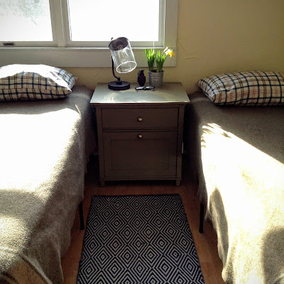 I also like the little table between the beds that I sanded down and painted with olive green milk paint last year. The rest needs serious help.