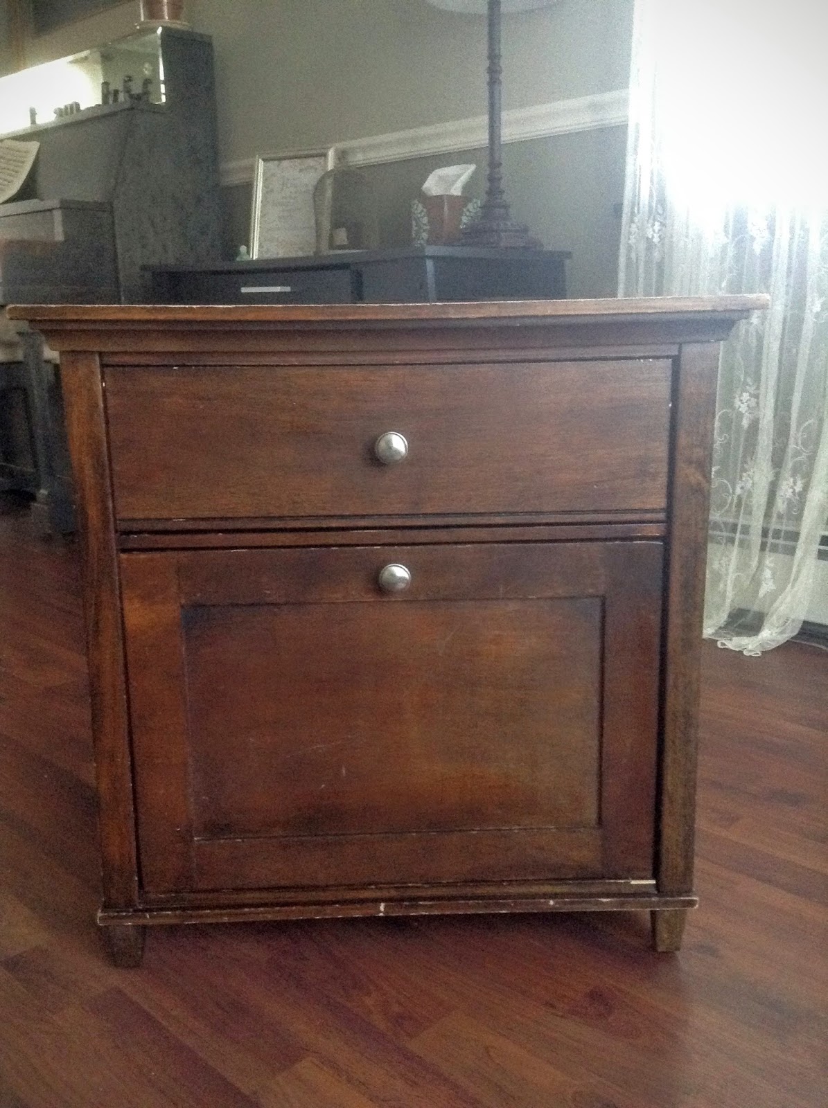 The dresser is in dire need of refinishing and it is on the short list of things I want to do in the house soon. It was a thrift store purchase by a friend who then handed it down to us when she moved so it is old and worn and looks awful in it's current condition, but I think it has some potential.
