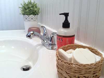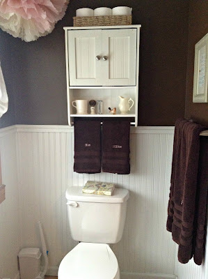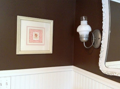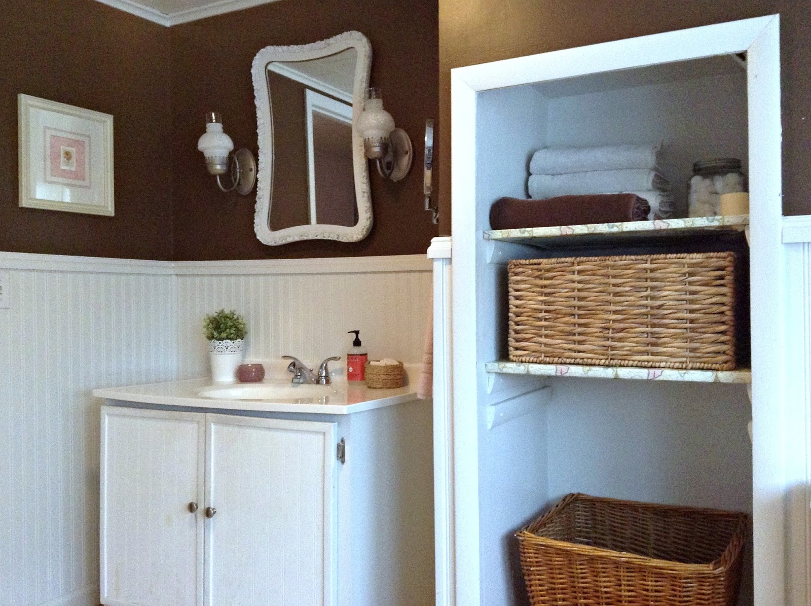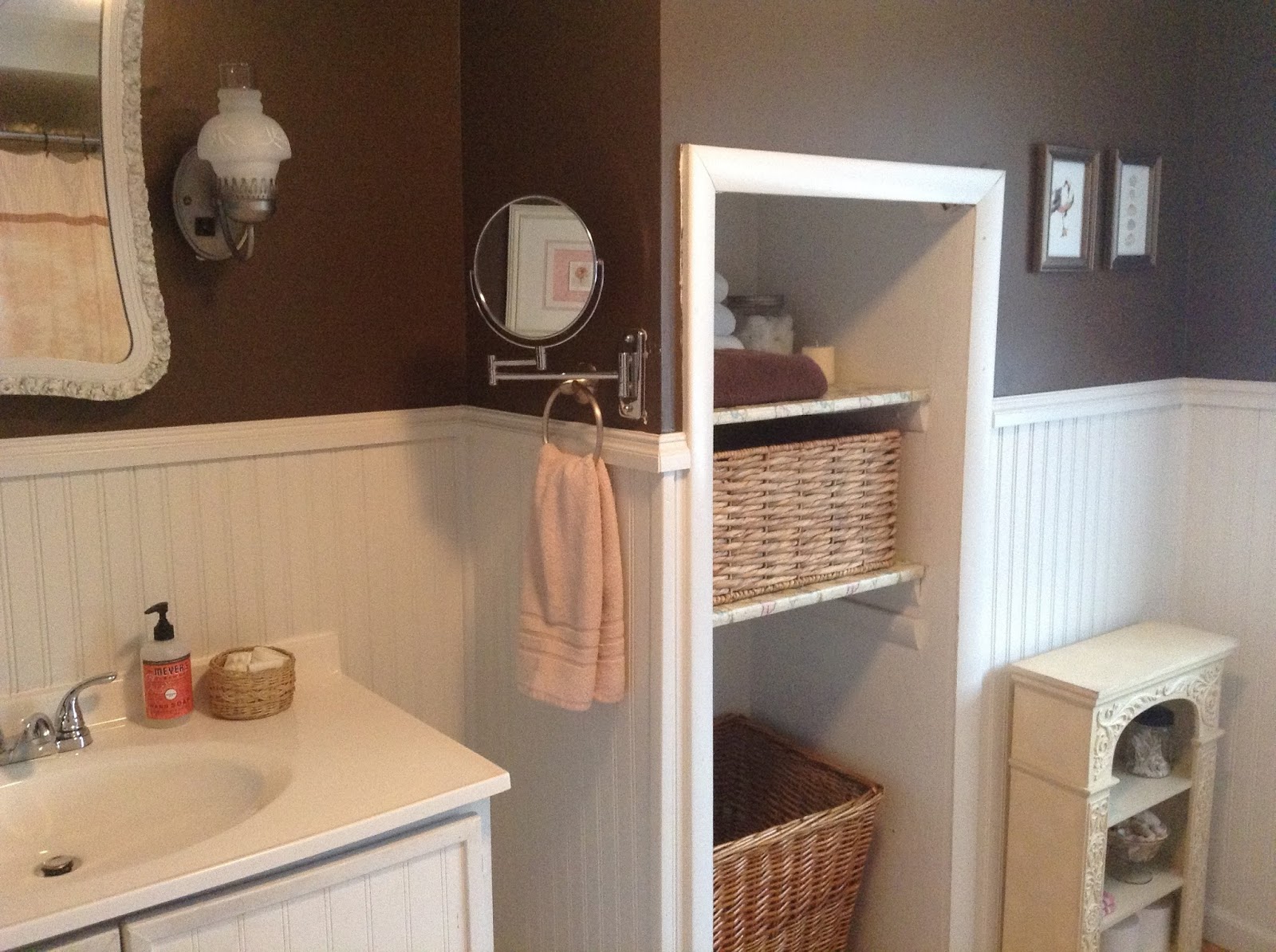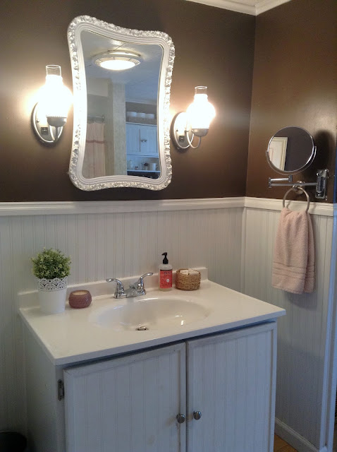 I love the beadboard, the fancy mirror/medicine cabinet, and the vintage wall sconces. They go well with the shabby chic vibe I already had going with my pink toile shower curtain.