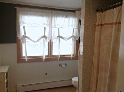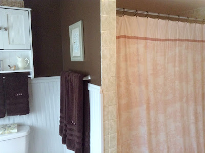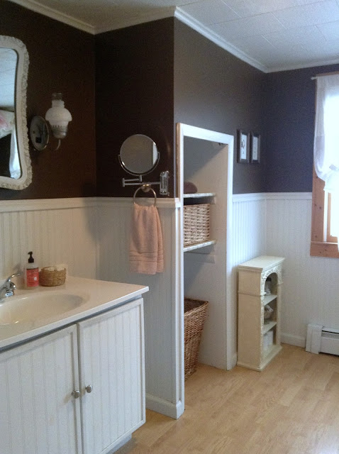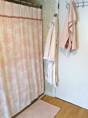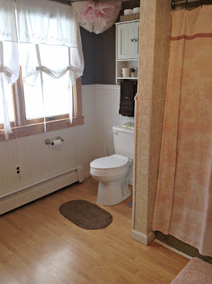 That's it--my shabby chic, pink and brown, upstairs bathroom with the 70s avocado bath tub. What do you think?