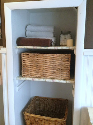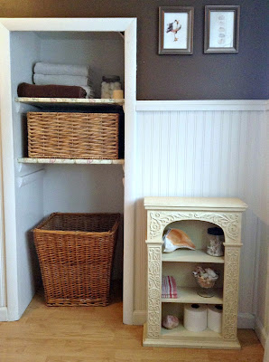 Across from the toilet there is a little cubby hole shelf area for towels and stuff, and a laundry basket: