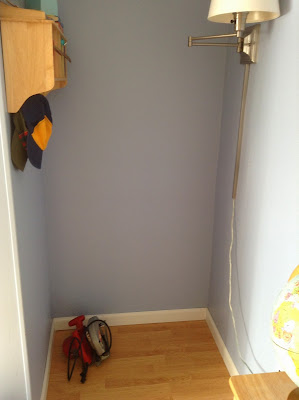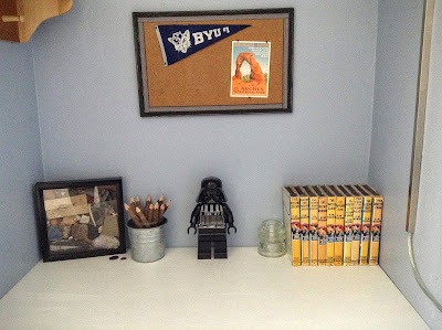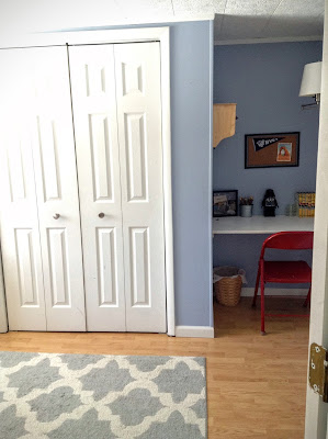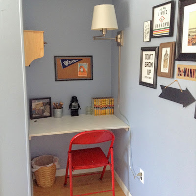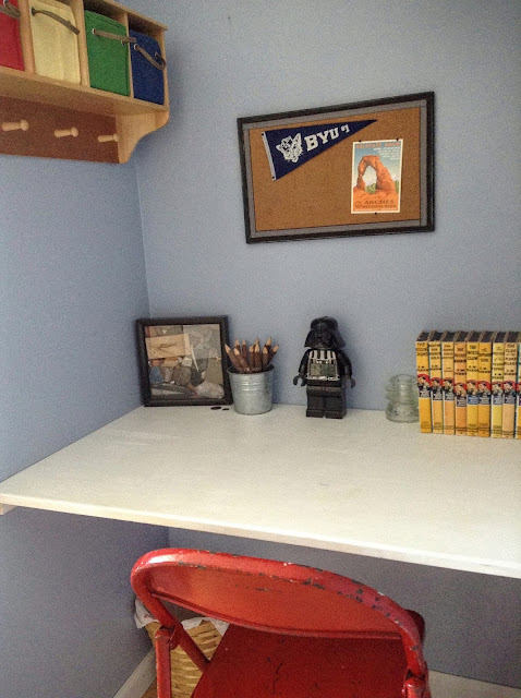 I'll eventually replace the cork board with a larger one. This is one that I just already had in the basement. The shelf with the colorful canvas bins might also be getting a makeover to help it look a little more grown up. I haven't exactly figured out what I'm going to do yet, but I have ideas. I had all the boys' hats on the pegs but they are home from school on winter break this week so the hats didn't even stay on the pegs long enough to act as a photo prop. I found the red folding chair in the basement when we moved in. It was gross, but I cleaned it up and it makes a nice distressed, vintage chair for the desk.