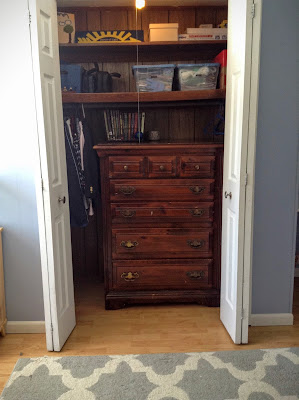 To the left of the desk is the closet. I stuck the dresser in there because why not. It fits and it frees up more space in the room for my kids to play.