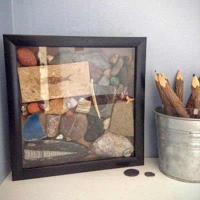 I found the shadow box frame on clearance for $5 so I filled it with a bunch of stuff from my boys' rock and fossil collection. It was all just sitting in a box and now they can enjoy it a little more.