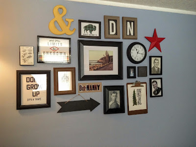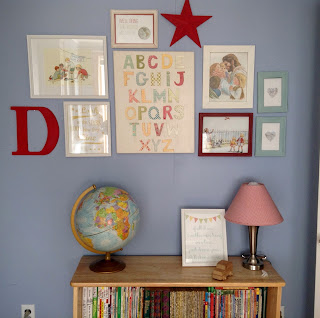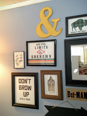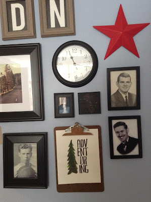 I'm still in the process of tweaking this a bit. I'm not sure how I feel about the ampersand and the star--I was wanting to tie some of the colors in one of the prints together, but I don't know if they work or not. I might just paint them both black. I'd also like to replace the photo I took at Acadia National Park (in the center) with an Ansel Adams print.