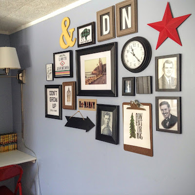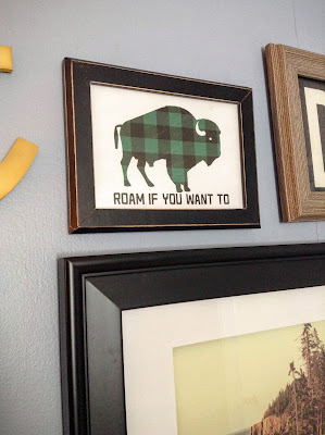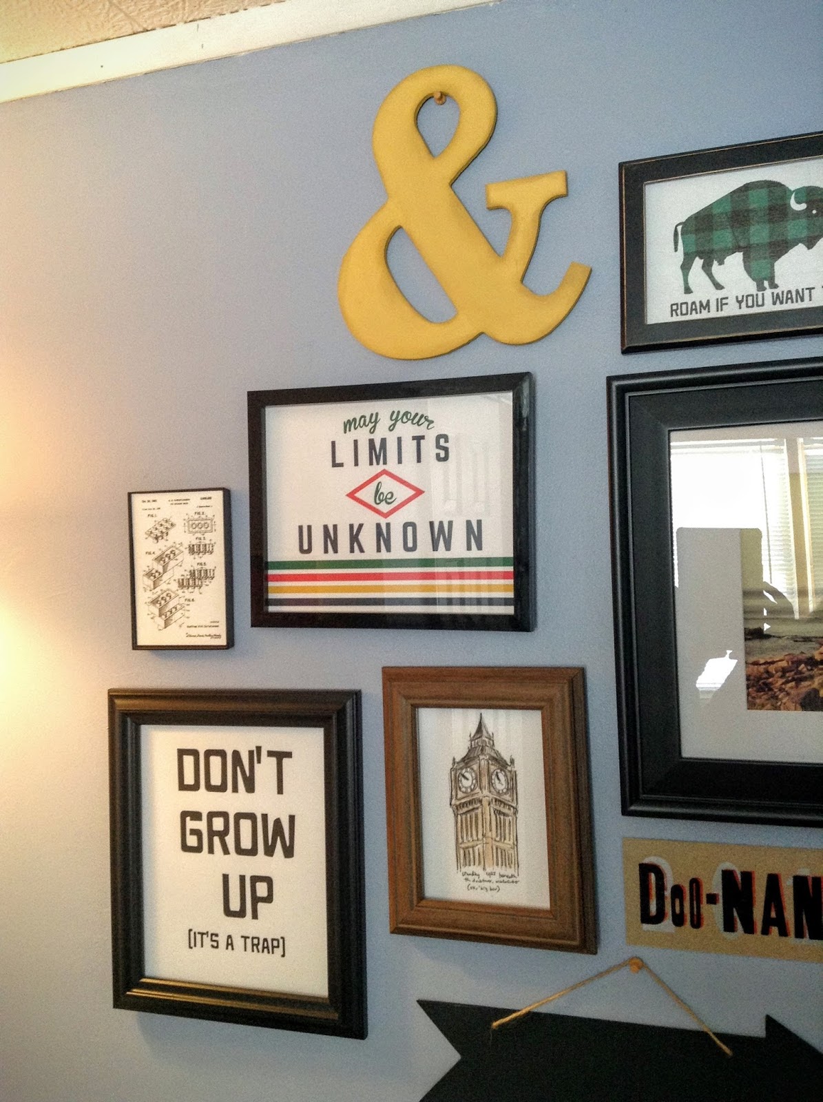 I tried to involve my boys in making choices for what kinds of things they'd like on their wall. I also wanted to use the nail holes that already existed in the wall. The result is a pretty eclectic assortment of art that kind of took on a life of its own as I tried to add in various requests and make everything look cohesive and balanced. I made four of the prints on the wall and I will share them eventually, the rest is a hodgepodge of stuff I found on Pinterest and stuff I already had.