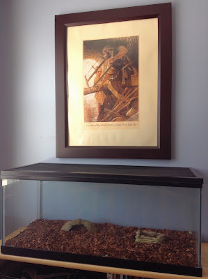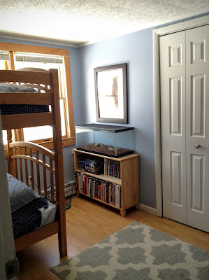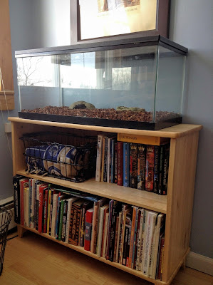 Our pet snake, Sir Hiss-A-Lot, lives on top of this bookcase by the window. Snakes are my favorite pet because I am not the best pet owner and this one doesn't require anything from me other than to fill his water occasionally. My husband takes care of the feeding and stuff.