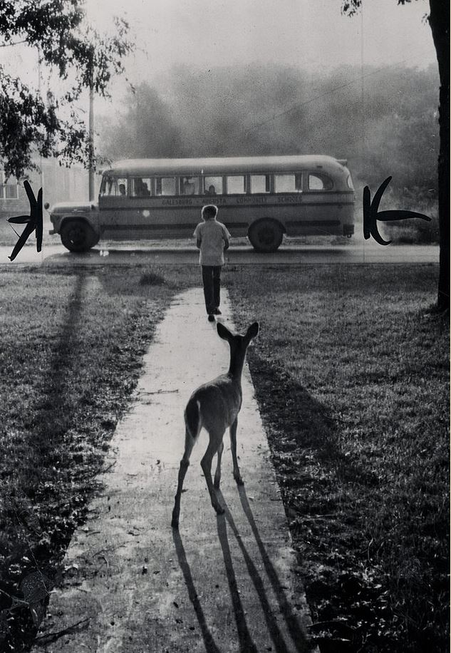 The pet fawn of Brad Curry of Galesburg, MI watches him depart from home every morning on his school bus (1960) | Photographer: UPI Telephoto. Source |
