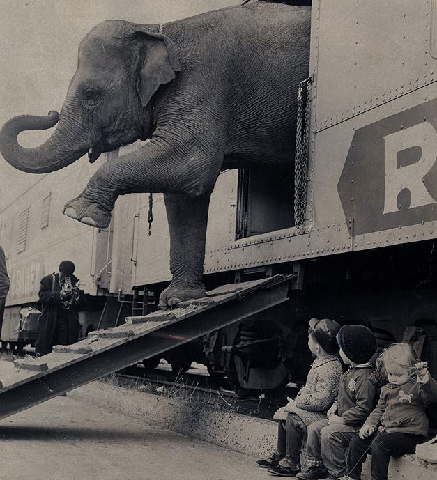 Targa the elephant disembarks from the circus train in the Bronx as most of her young visitors watch (1963). |Photographer Paul Rice. Source. |